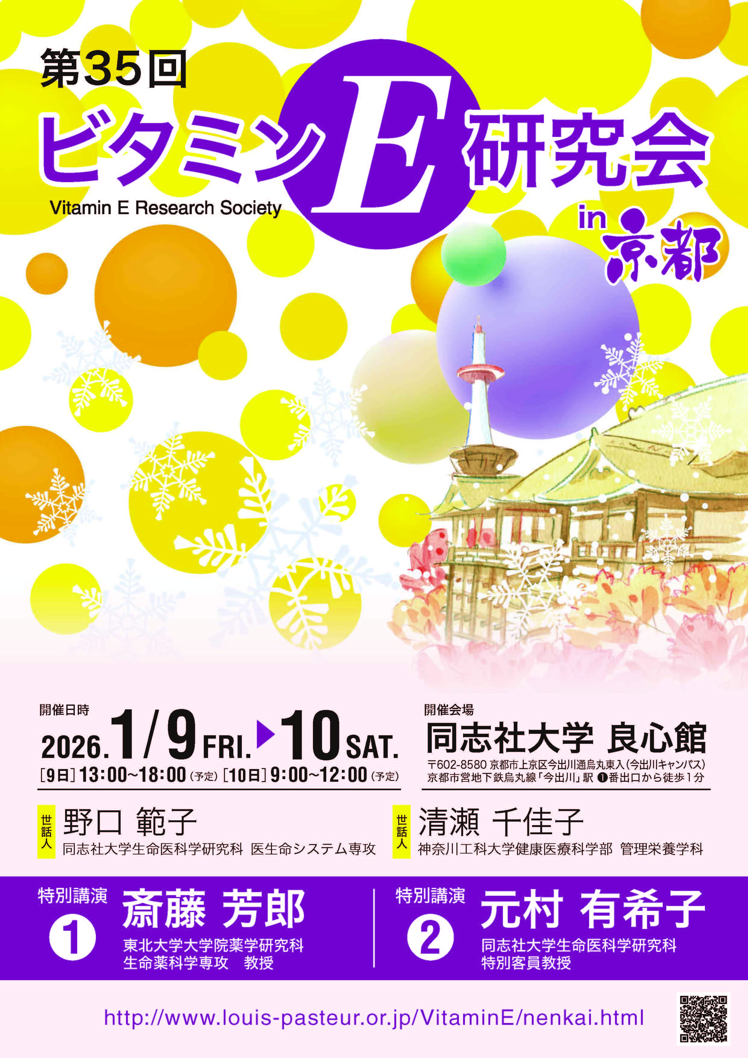 第35回ビタミンE研究会を2026年1月9日(金)、10日(土)同志社大学良心館(京都市)にて開催することとなりましたのでご案内申し上げます。本研究会は「ビタミンE」に関連するテーマについて研究者が各学会の枠を越え基礎と臨床の両面より討議し、お互いの向上とさらなる発展を図る場として開催しております。第35回につきましても、現地開催にて研究者の皆さまとの懇親を含めた、活発で活気ある会といたしたく思っております。皆さまからの多数の演題ご応募ならびにご参加を、心よりお待ち申し上げております。何卒よろしくお願い申し上げます。